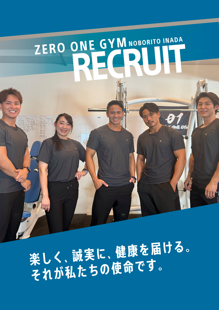 ゼロワンジムで働くことは、単なる仕事ではありません。トレーニングに対する情熱を持ち、トレーニングを通じて人々の健康を支えたいという志を共有できる仲間を心から歓迎します。あなたの力で、日本を健康にする未来を一緒に作りましょう!